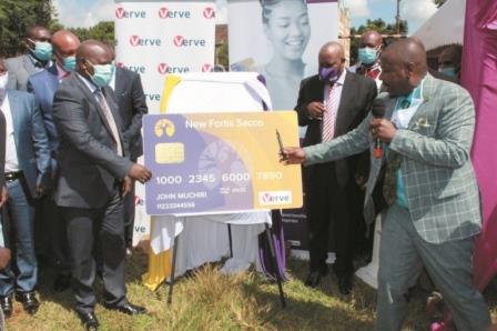 Nyeri Governor H.E Mutahi Kahiga (left) and the Chairman of NewFortis Sacco Mr. John Githinji launching the Verve Debit card. [PHOTO – COURTESY Resilient Sacco defies odds in a...